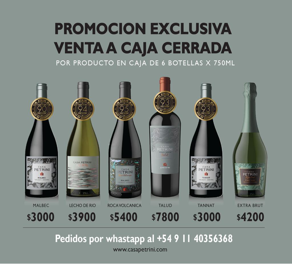 La promoción contempla la venta a caja cerrada de seis botellas de su Malbec (a $3.000), Lecho de Río ($3.900), Roca Volcánica ($5.400), Talud ($7.800), Tannat ($3.000) y Extra brut ($4.200).