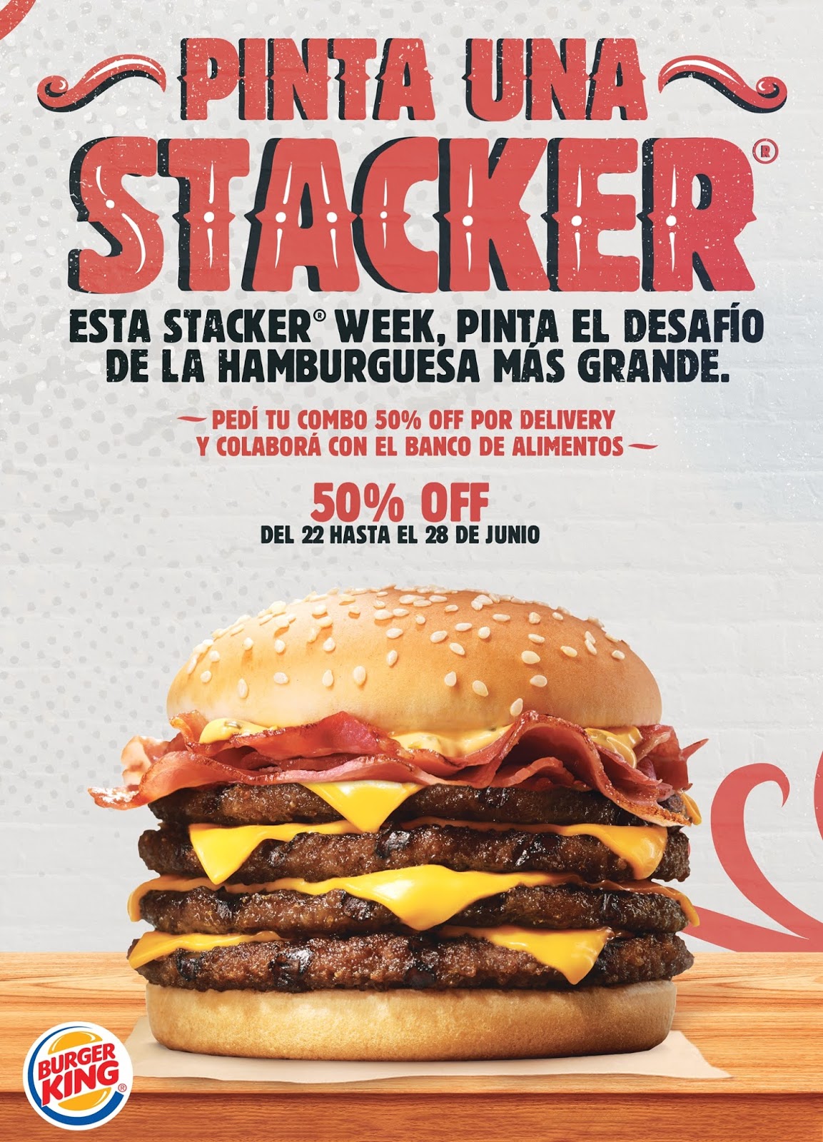 Por sexto año consecutivo, y adaptándose al nuevo contexto, Burger King realizará una nueva versión de su Stacker Day que, en esta oportunidad, se extenderá durante una semana convirtiéndose en la primera Stacker Week de Argentina. Del 22 al 28 de junio inclusive, los fanáticos de esta hamburguesa podrán acceder a su Combo Stacker con un 50% de descuento por AutoKing, Delivery o Take Away en los locales habilitados y, con su compra, estarán colaborando con el Banco de Alimentos de Buenos Aires.