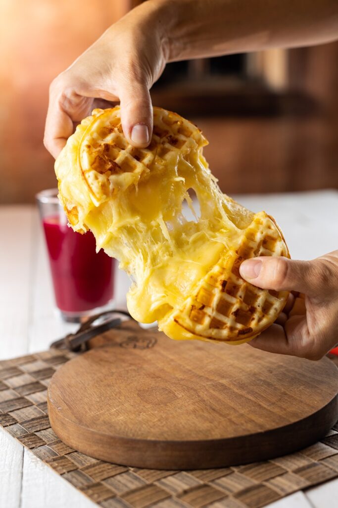 El waffle de pan de queso está disponible en packs por cinco unidades redondos porque tienen más peso por pieza por su contenido de queso y se cocinan en el mismo tiempo.
