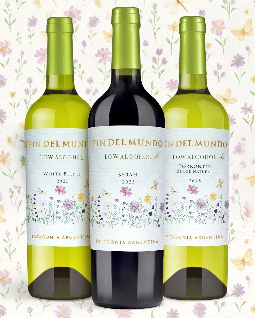 Fin Del Mundo Low Alcohol es una línea de vinos naturalmente bajos en alcohol de la Patagonia compuesta por un Syrah, un White Blend y un Torrontés Dulce Natural.