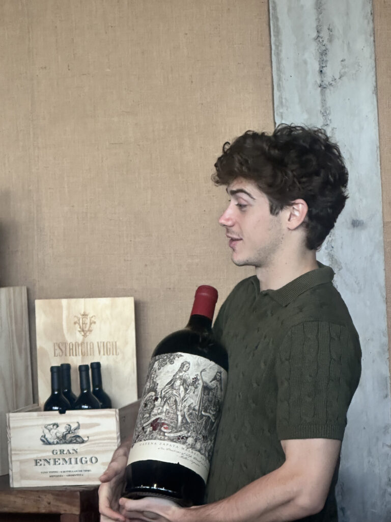 Promediando el almuerzo recibió dos obsequios con una dedicatoria de Alejandro Vigil: un box que contenía su último vino premiado con 100 puntos, As Bravas Malbec 2018 de su bodega El Enemigo, entre otros; y un botellón de seis litros de Malbec Argentino, de la bodega Catena Zapata.