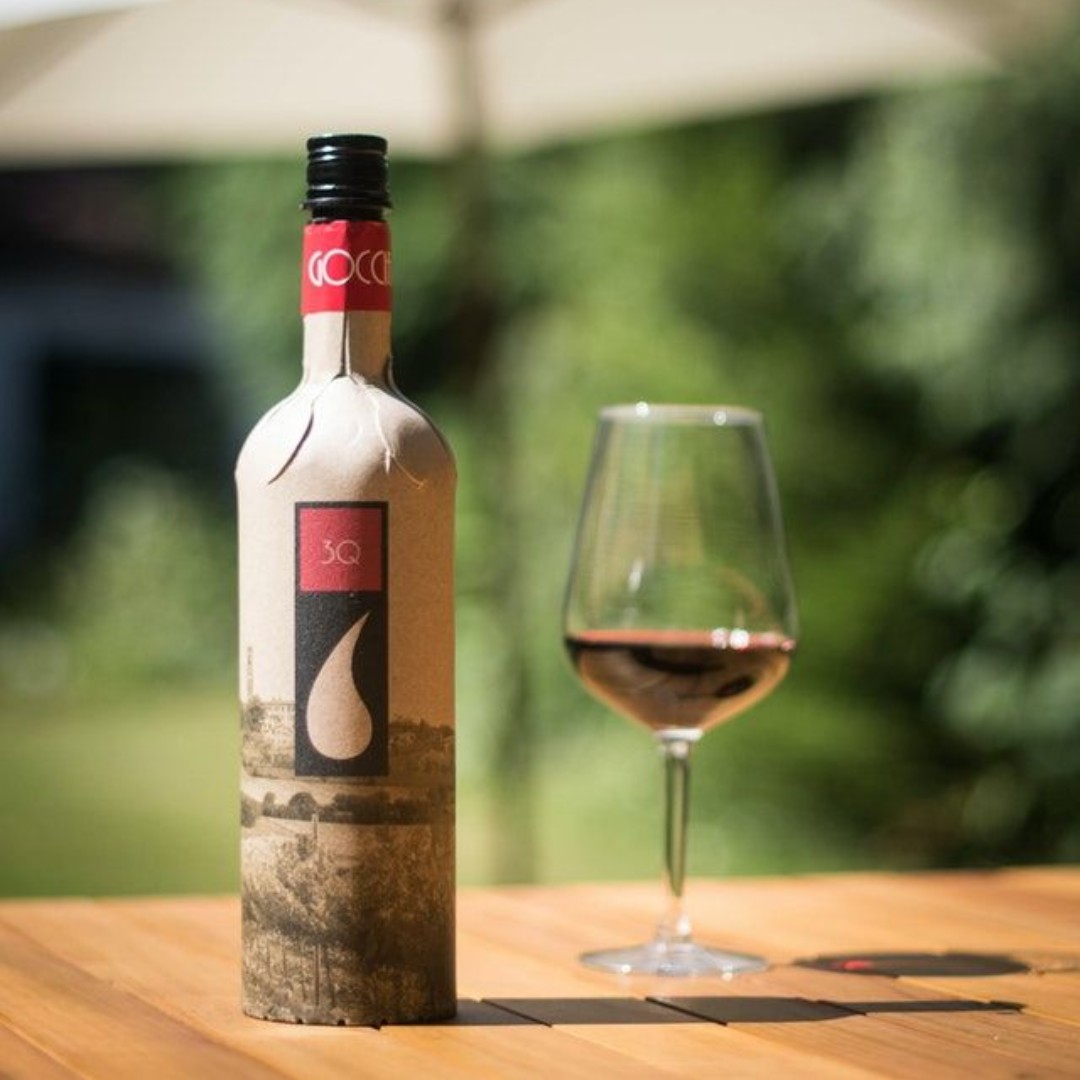 El primer vino que salió a la venta envasado en la botella Frugal es el vino tinto joven 3Q de la bodega italiana Cantina Goccia.