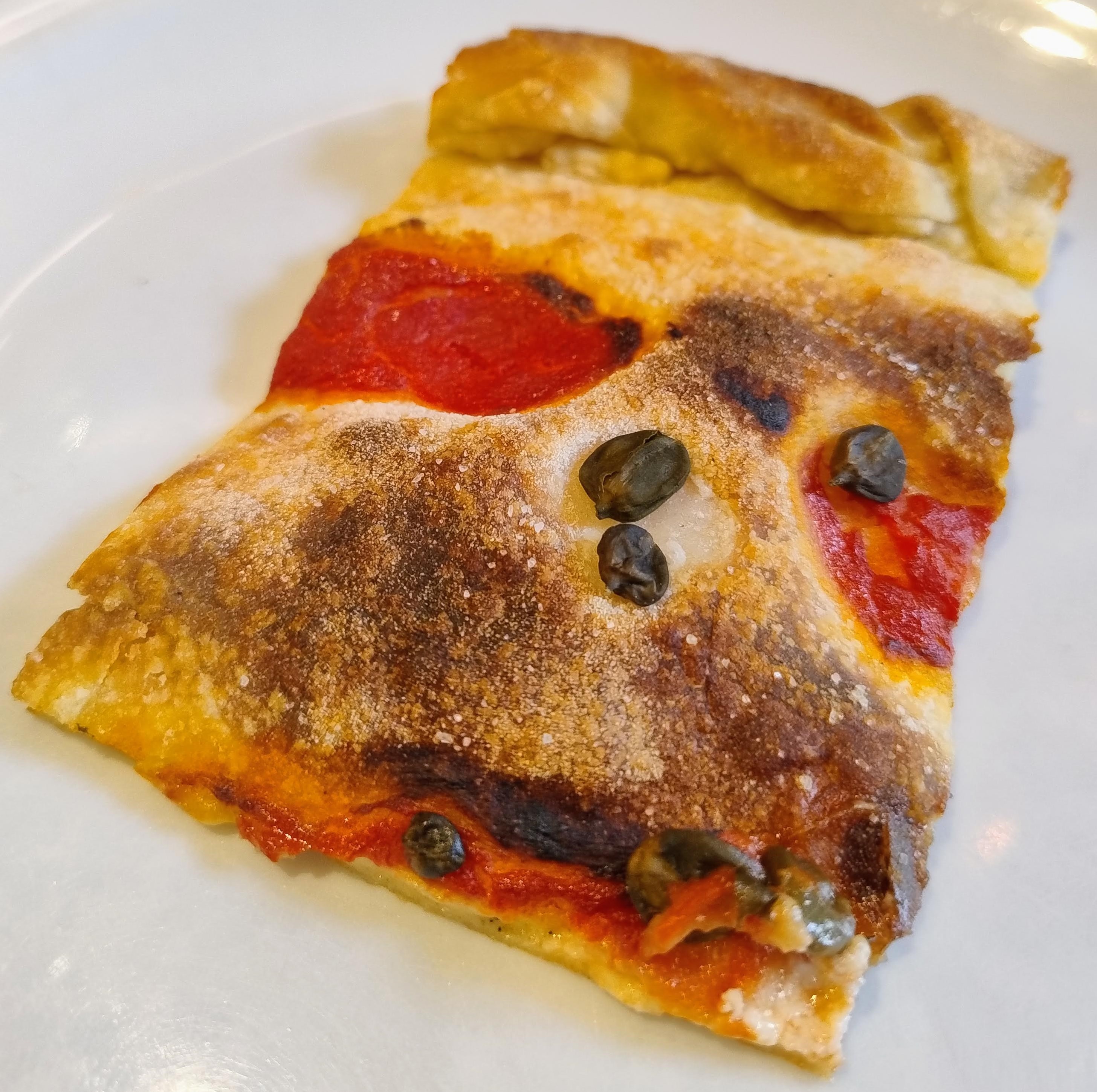 Sfoglia Pizzata: Una delicada masa de pizza fina rellena de queso cremoso, passata de tomates, aceitunas negras, orégano y alcaparras.