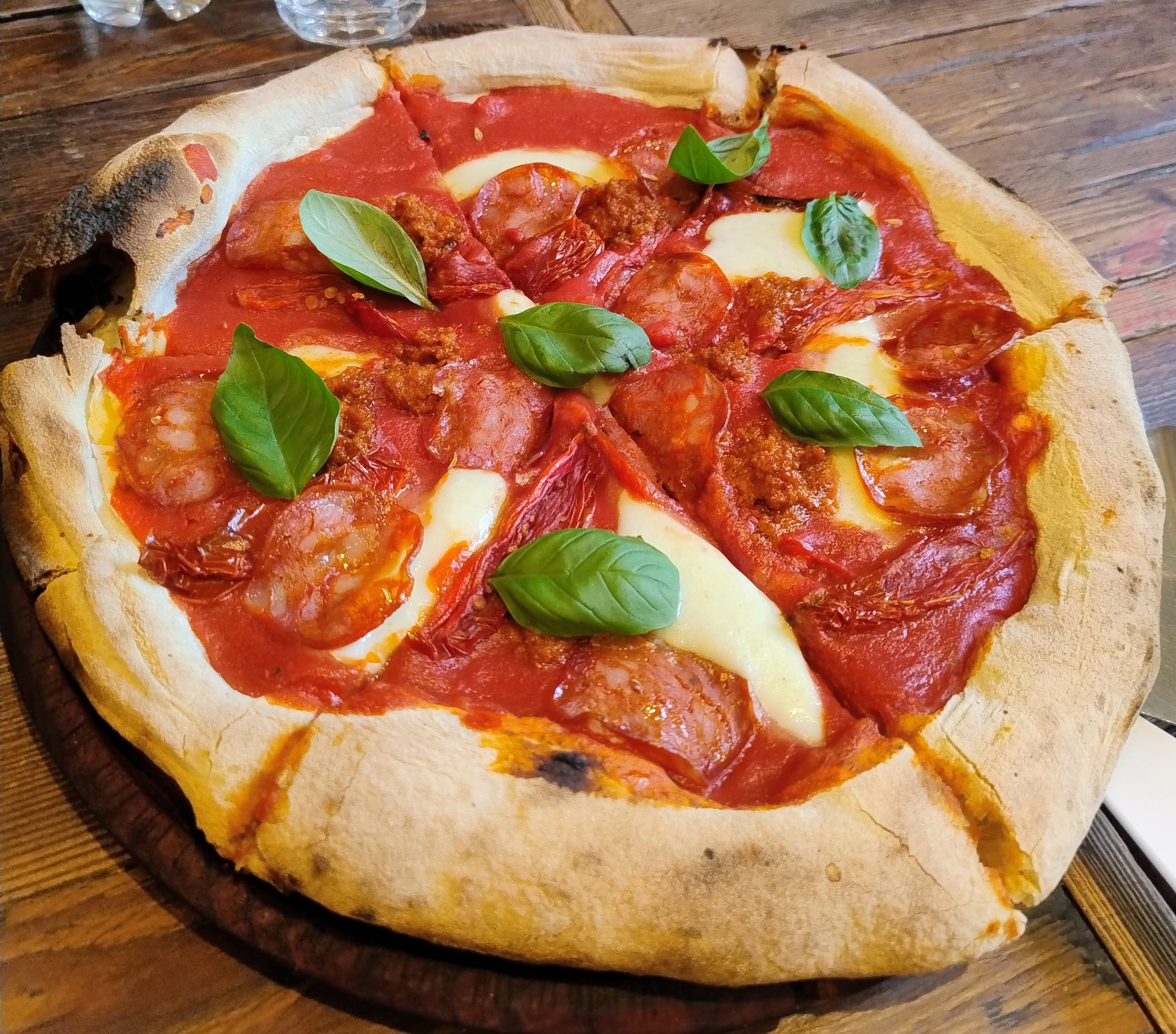 Pizza Calabresa (Receta Original): Elaborada con passata de tomates, polpetta de búfala, tomates secos, pasta de nduja y el auténtico salame calabrese original.