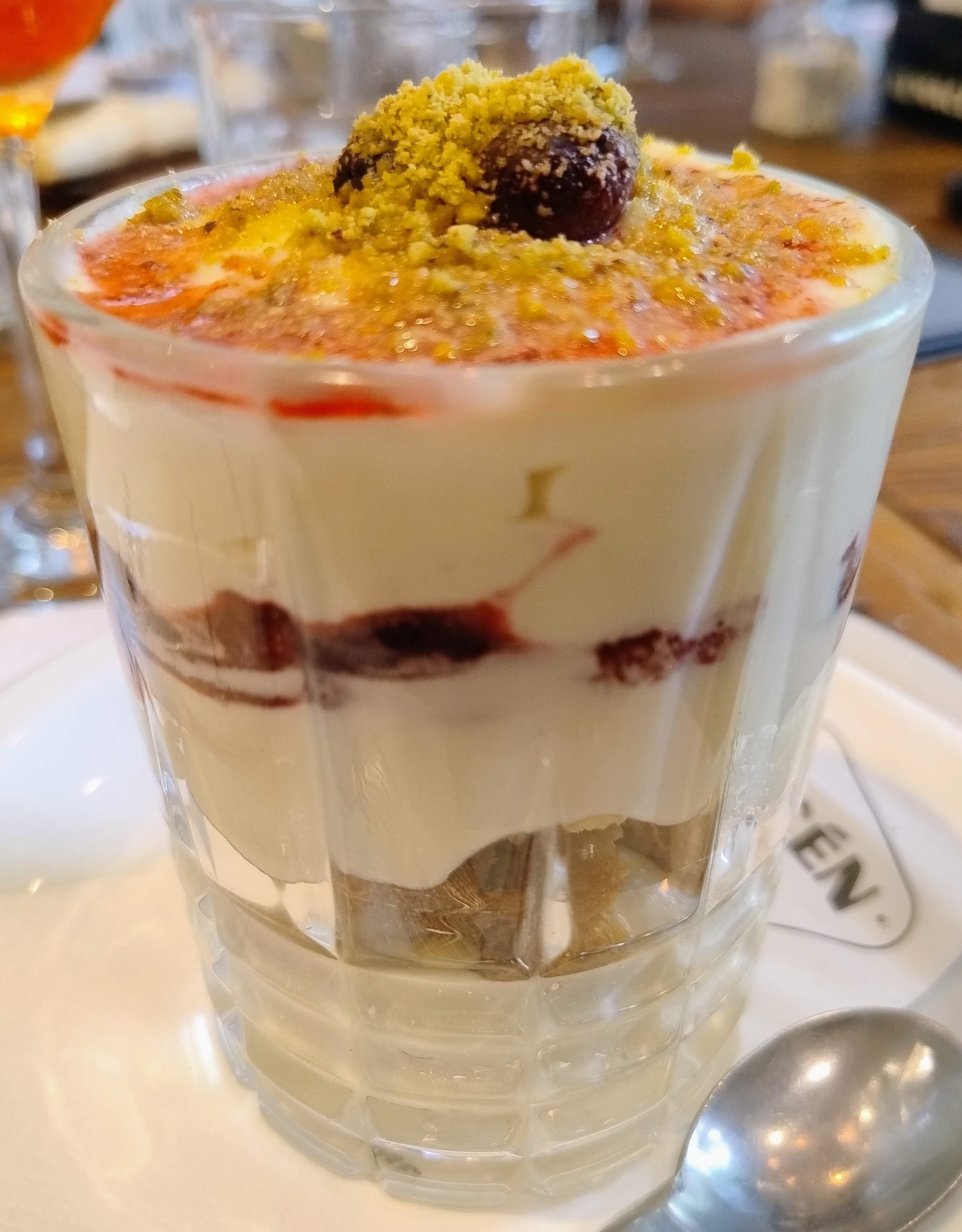 Dolce: Cremoso de Mascarpone con biscotti, frutos rojos y pistachos picados.
