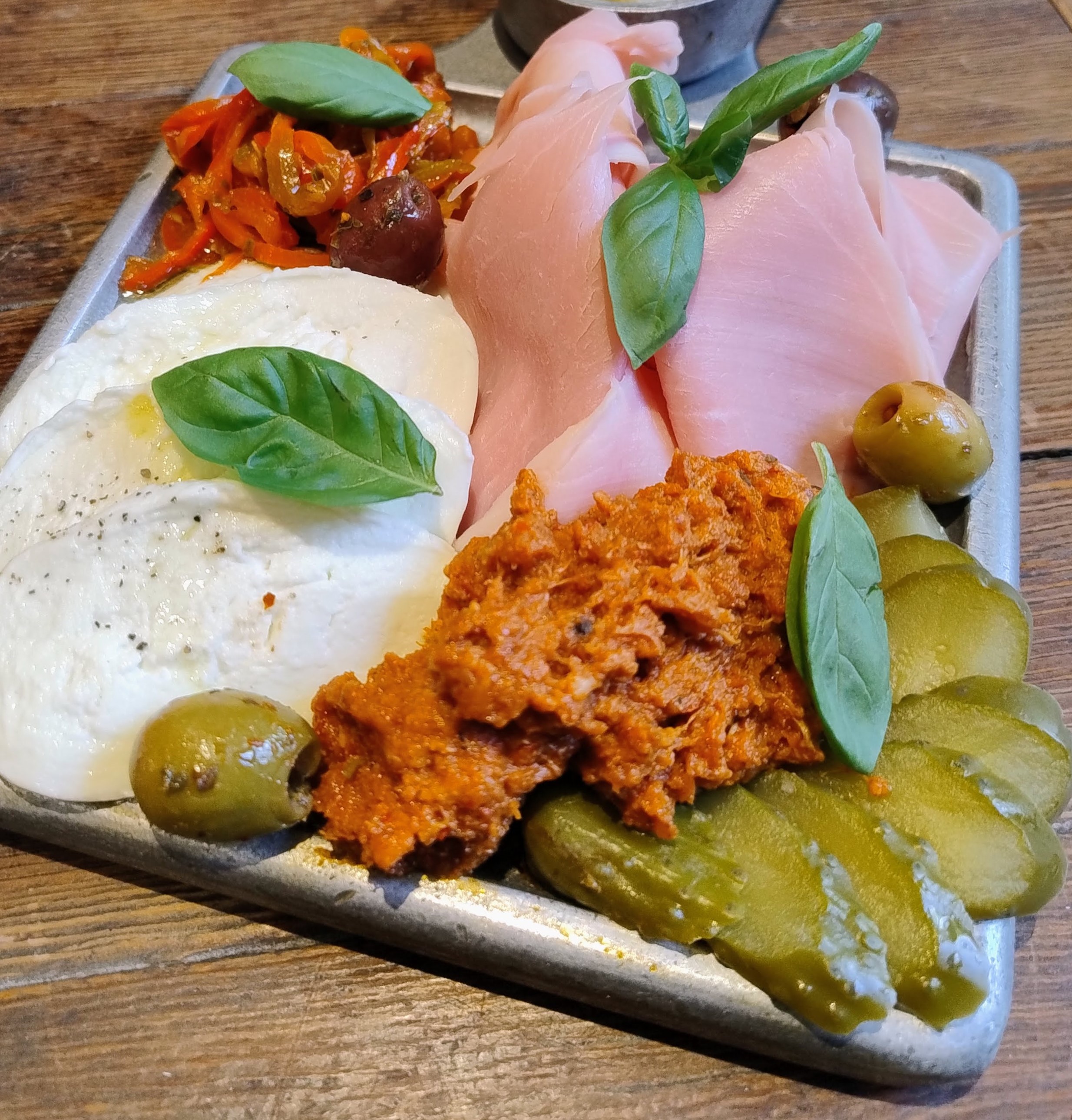 Antipasto: ‘Nduja Calabresa: Una combinación intensa de pasta de ‘nduja, jamón de cerdo natural, pimientos agridulces, polpeta de búfala, pepinillos agridulces, crema de ricota, pan de pizza y aceitunas marinadas.