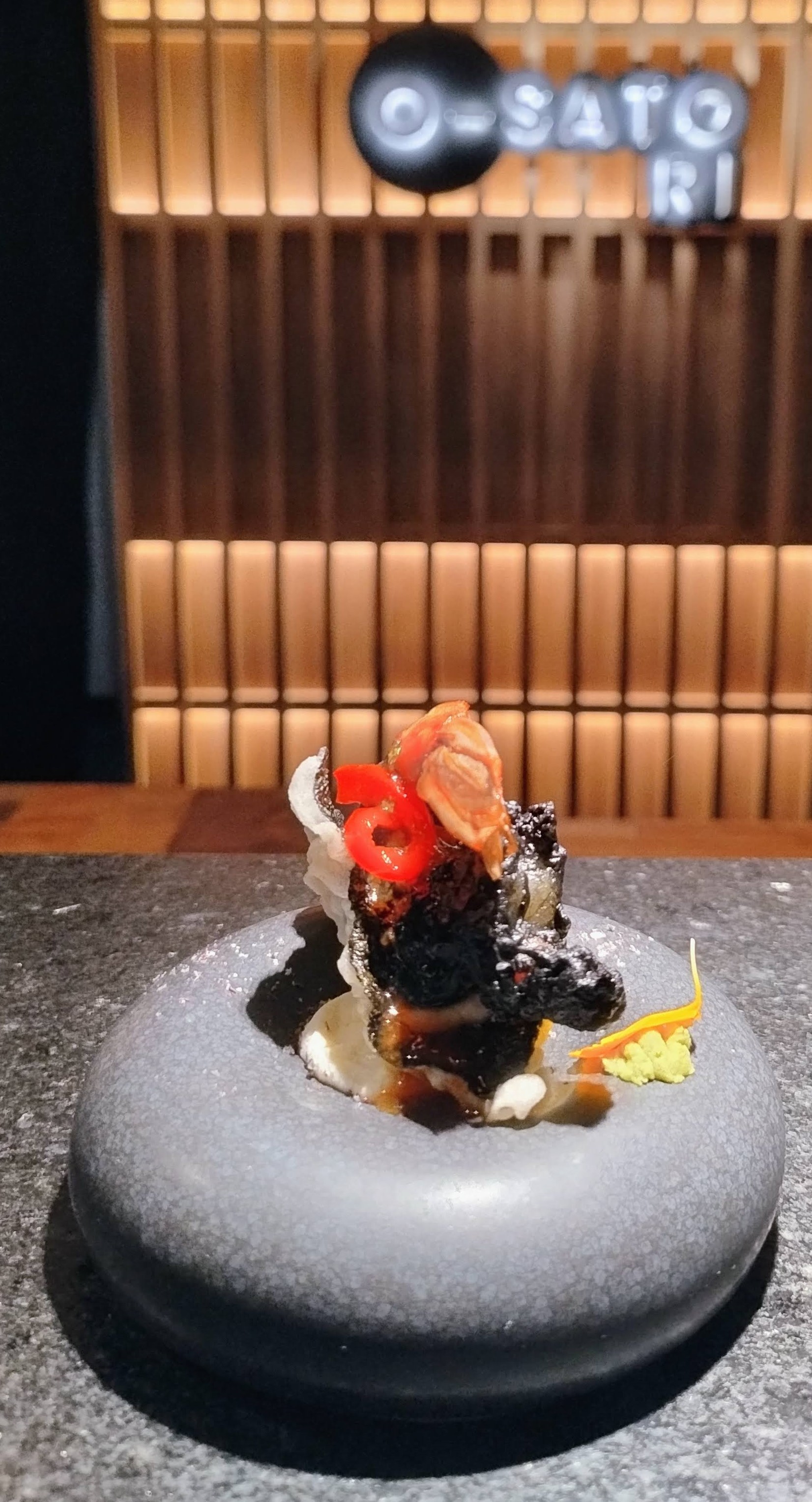 8. Tempura Obsidiana: Langostino en tempura negra, guayaba y habanero. Crujiente, dulce y picante. Pico final de intensidad.